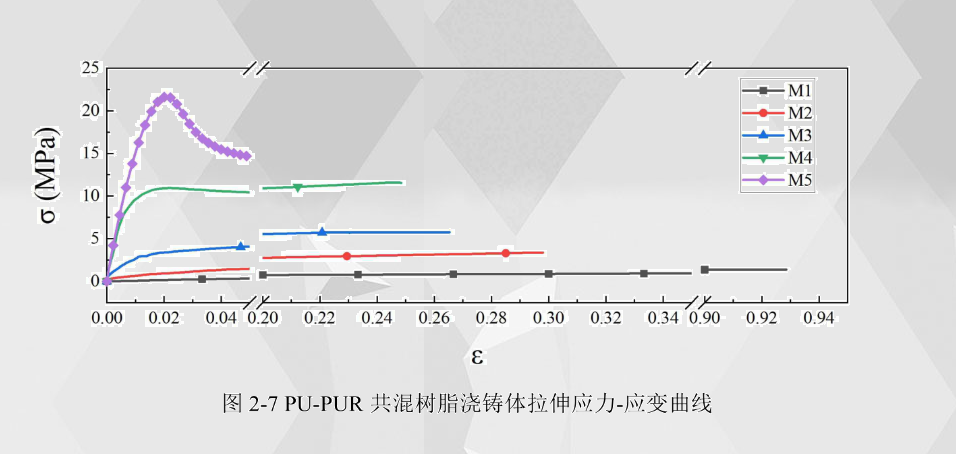 通過數(shù)值計(jì)算得到PU-PUR共混樹脂澆鑄體的拉伸應(yīng)力-應(yīng)變曲線如圖2-7所示。從曲線中可以看出,隨著聚脲所占比例的不斷增加,拉伸應(yīng)力-應(yīng)變曲線開始表現(xiàn)出更多的塑性形變特征,曲線上出現(xiàn)屈服階段,在M3、M4和M5中,即聚脲成分占共混樹脂比例達(dá)到50%及以上時(shí)屈服階段表現(xiàn)地更明顯。同時(shí)由于聚脲所占比例的增加帶來硬段成分的增加,使得拉伸試樣相比于較低聚脲含量的樹脂澆鑄體所能承受的拉伸位移更短。