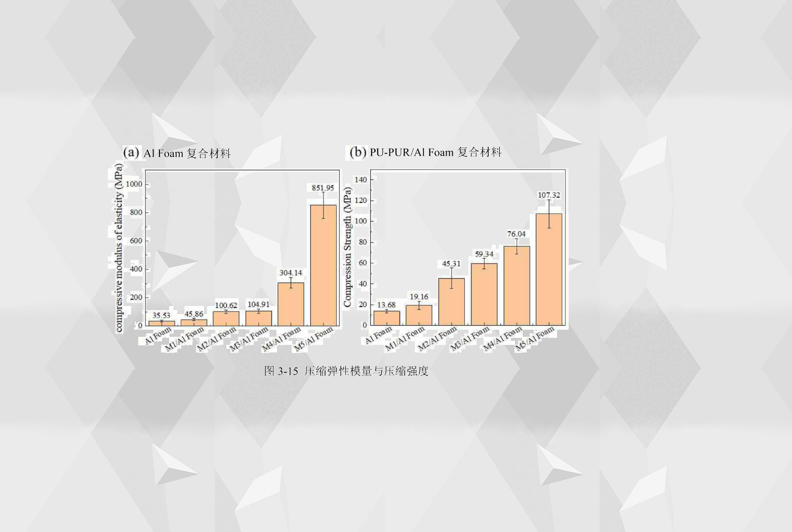 壓縮強度表示材料抵抗壓縮載荷而不失效的能力,從圖3-15(b)中看到,PU-PUR/Al Foam復(fù)合材料的壓縮強度都隨著聚脲含量的增大而提高。Al Foam的壓縮強度為13.68MPa,而M1/Al Foam的壓縮強度為19.16 MPa,比Al Foam增加了40.05%。M2/Al Foam的壓縮強度為45.31MPa,比M1/Al Foam增加了136.48%。M3/Al Foam的壓縮強度為59.34MPa,比M2/Al Foam增加了30.96%。M4/Al Foam的壓縮強度為76.01MPa,比M3/Al Foam增加了28.14%。M5/Al Foam的壓縮強度最高,為107.32MPa,比M4/Al Foam增加了41.13%。