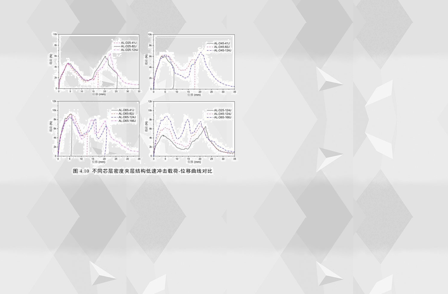 為了了解泡沫芯層對(duì)夾層結(jié)構(gòu)沖擊性能的影響,分別選擇了三種不同芯層密度和三種不同芯層高度的夾層結(jié)構(gòu)作為研究對(duì)象,需要特別說明的是,這六種配置的試件,其面板均由厚度相同的鋁合金制成。圖4.10為相同配置夾層結(jié)構(gòu)在不同沖擊能量下及不同芯層密度的試件在穿透能下的載荷-位移曲線,通過對(duì)比可以看出,當(dāng)芯層密度從0.45g/cm3增加到0.65g/cm3時(shí),載荷-位移曲線的形式發(fā)生了很大變化,曲線的峰值載荷由兩個(gè)變?yōu)槿齻€(gè),且曲線的波峰和波谷均隨芯層密度的增加而增加。