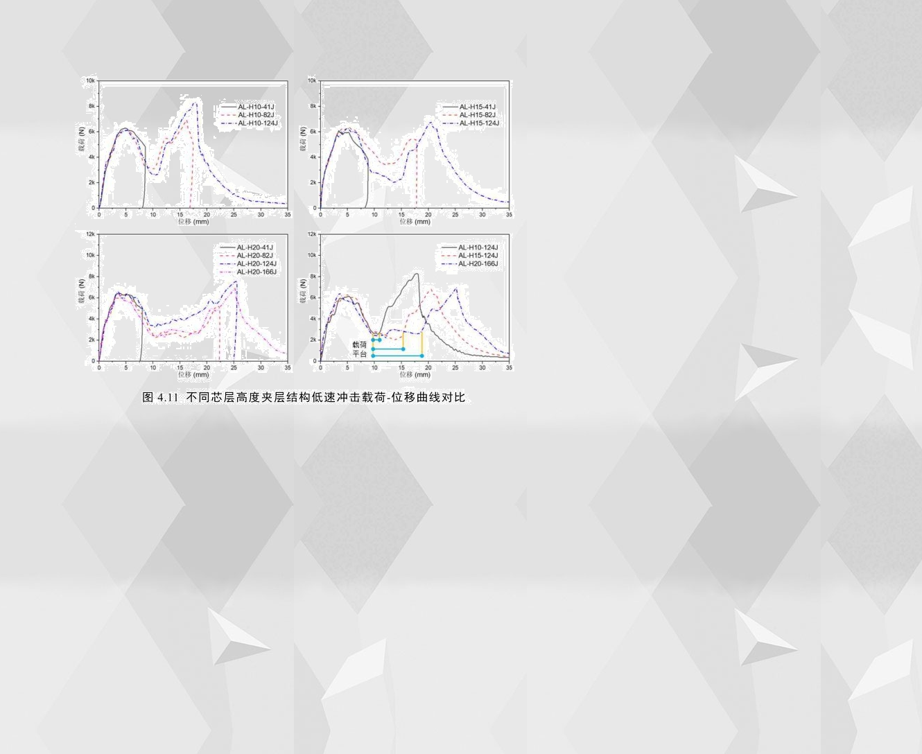 圖4.11為相同配置的夾層結(jié)構(gòu)在不同沖擊能量下及不同芯層高度的試件在穿透能下的載荷-位移曲線,通過對(duì)比可以看出,芯層高度為10mm、15mm和20mm的試件的載荷-位移曲線基本相似,曲線均具有兩個(gè)波峰且波谷處載荷大小相差不大;不同的是,隨著試件芯層高度的增加,波谷附近的載荷平臺(tái)的長(zhǎng)度逐漸變長(zhǎng)。
